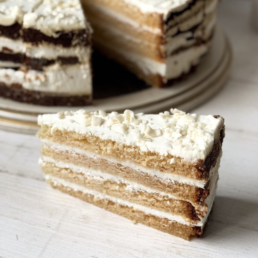 изысканный торт из слоев нежного бисквита и творожного крема. Сверху торт украшен посыпкой из белого шоколада