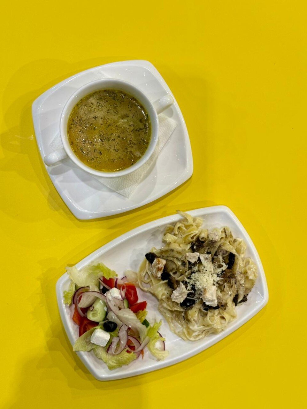 Лапша с курицей, салат греческий, паста с курицей и грибами