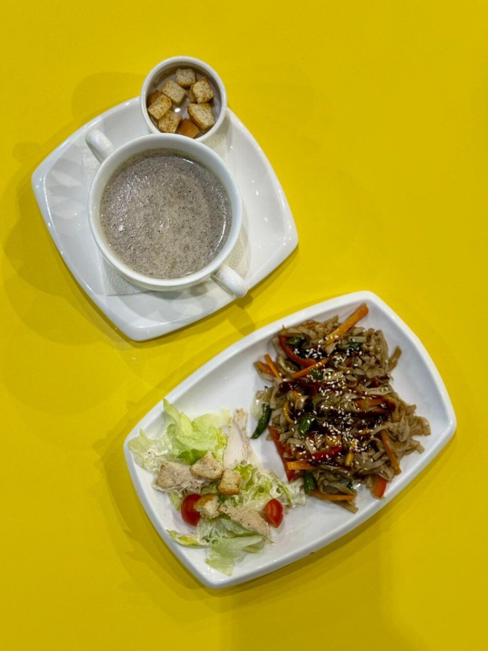 Крем-суп грибной, цезарь с курицей, вок с овощами