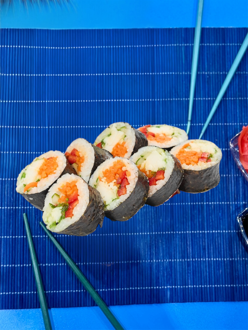 Краб, чука, перец болгарский, айсберг, огурец, морковь по-корейски, кунжут